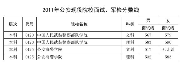 河南省2011年高招公安現(xiàn)役院校面試、軍檢分?jǐn)?shù)線
