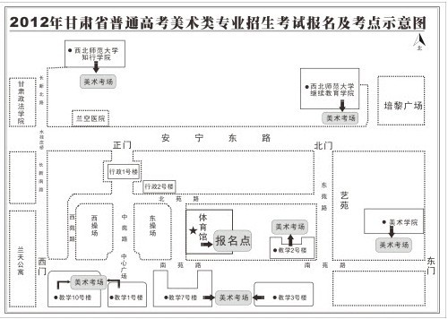 請各位考生及早熟悉考場安排,做好考試準(zhǔn)備工作。凡考場安排在西北師范大學(xué)知行學(xué)院考點(diǎn)的考生,請及早熟悉行走路線,考務(wù)組將在報(bào)名點(diǎn)安排專人帶考生前往知行學(xué)院考點(diǎn);乘車時(shí)請?jiān)谒畳烨f橋下車,沿甘肅政法學(xué)院東面圍墻往北行400米即到。凡考場安排在西北師范大學(xué)繼續(xù)教育學(xué)院考點(diǎn)的考生,步行從培黎廣場站往北走100米即到。報(bào)名及考點(diǎn)示意圖如下: