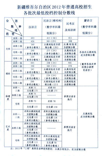 天山網(wǎng)訊(記者劉若涵 李敏報(bào)道)6月27日,新疆2012年普通高校招生各批次最低投檔控制分?jǐn)?shù)線向社會(huì)公布。漢語言文科一本為493分、理科一本為445分,錄取工作將于7月3日正式開始。