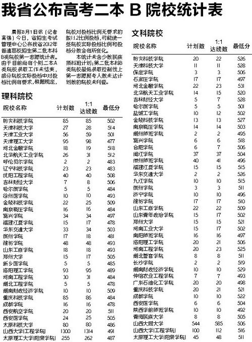 晨報(bào)8月1日訊 今日,省招生考試管理中心公布我省2012年普通高校招生第二批本科B類院校第一志愿統(tǒng)計(jì)表。由于目前尚有個(gè)別二本A類院校錄取工作未結(jié)束,部分院校實(shí)際投檔中對投檔比例有要求,根據(jù)規(guī)定,院校對投檔比例無要求的按1:1.2比例投檔,可能使一些院校實(shí)際投檔比例和投檔分?jǐn)?shù)會(huì)有所變化。