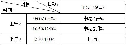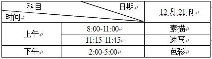 考試時(shí)間安排與普高美術(shù)類相同。2013年12月20日考生憑《專業(yè)考試證》、第二代居民身份證到湖南師范大學(xué)工程與設(shè)計(jì)學(xué)院報(bào)到繳費(fèi),參加考試。