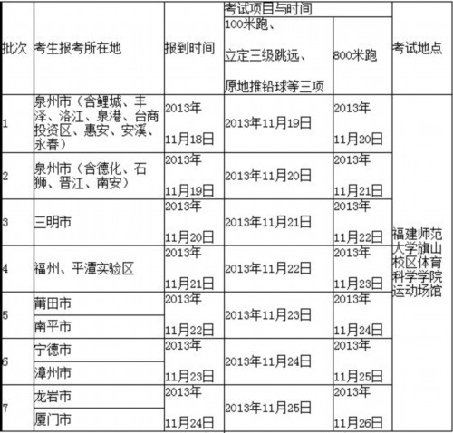 2014年福建省普通高校體育類專業(yè)招生省級統(tǒng)一考試安排表
