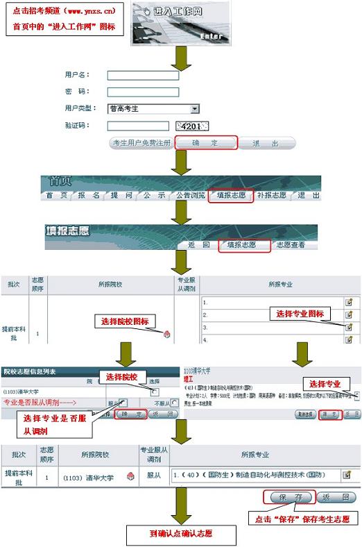 在填報截止時間之前,考生登錄工作網(wǎng)(www.ynzs.cn或www.ynzk.cn),自行進行志愿填報;在確認截止時間之前,考生攜帶準考證到確認點進行確認、簽字,完成志愿填報。