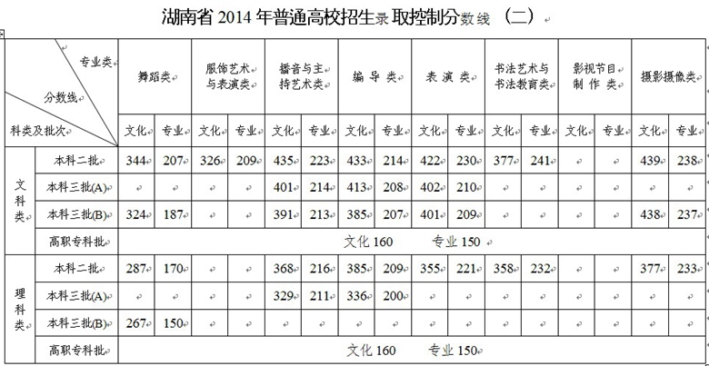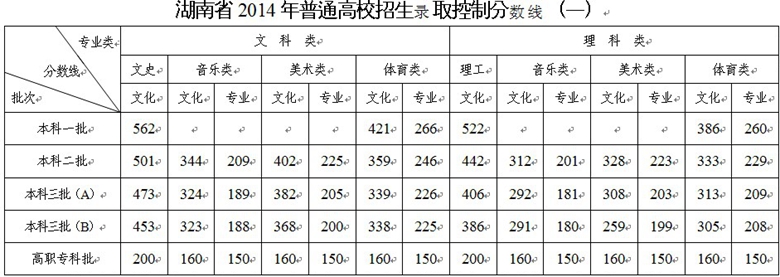 湖南省2014年普通高校職高對口招生錄取控制分?jǐn)?shù)線