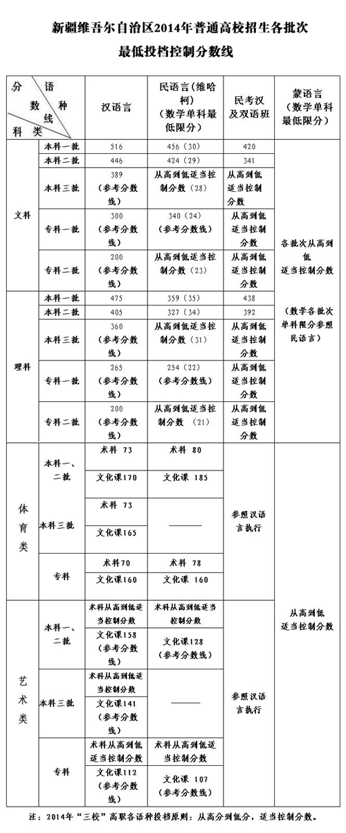 2014年自治區(qū)普通高校招生各批次最低投檔控制分?jǐn)?shù)線根據(jù)“科學(xué)、嚴(yán)謹(jǐn),兼顧招生工作實(shí)際”的原則,綜合考慮區(qū)內(nèi)外高校在疆招生計劃數(shù)、考生成績、錄取投檔方式等因素劃定。