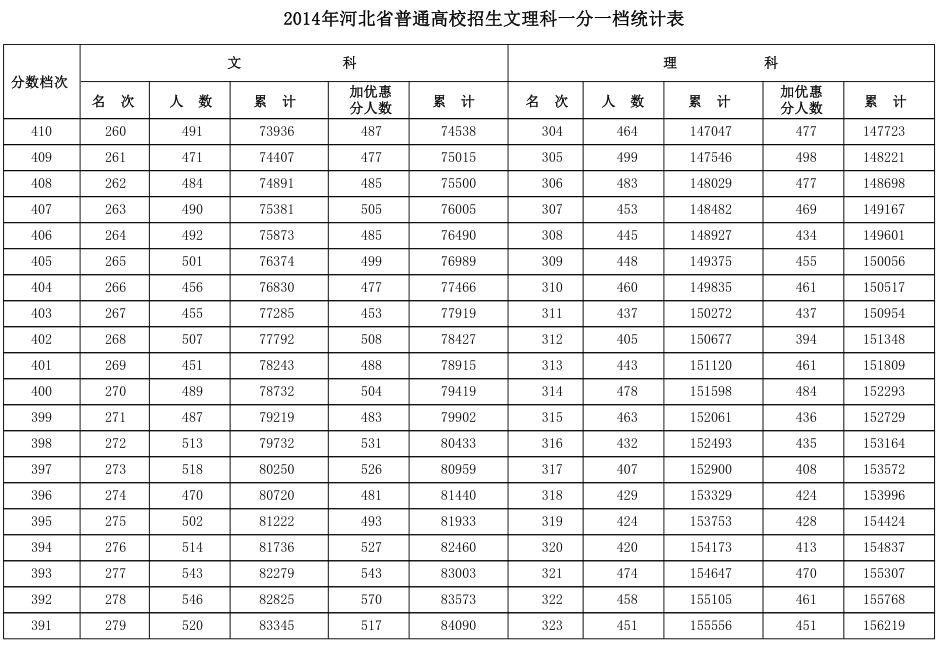 上一篇文章:2014年河北省普通高校招生文理科一分一檔統(tǒng)計表(411分-710分以上)