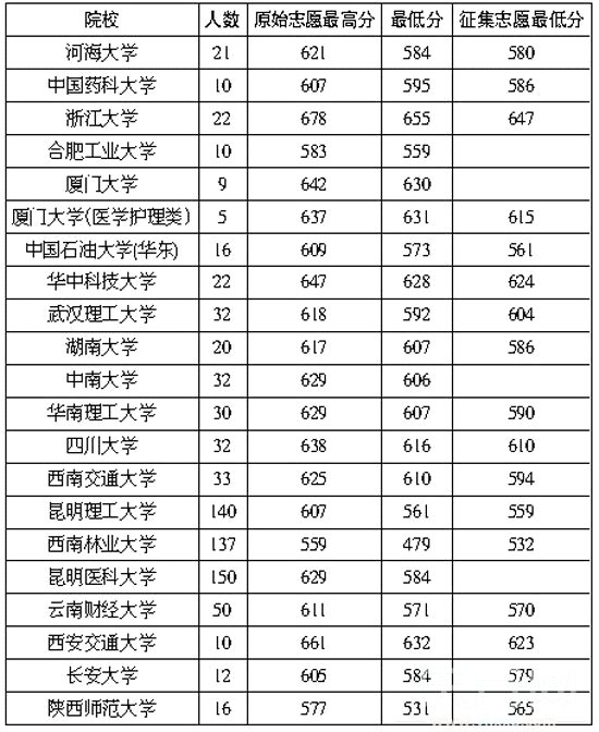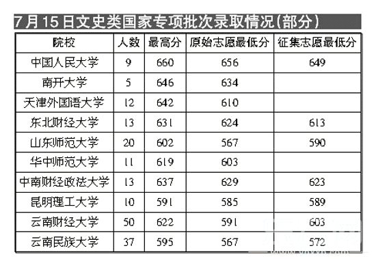 云南信息報(bào)訊(作者:韓海闊)昨日,省招考院繼續(xù)公布國家專項(xiàng)批次的錄取情況,部分院校在該批次的志愿征集工作已經(jīng)完成,部分院校的征集志愿最低分甚至追平了原始志愿錄取的最高分。