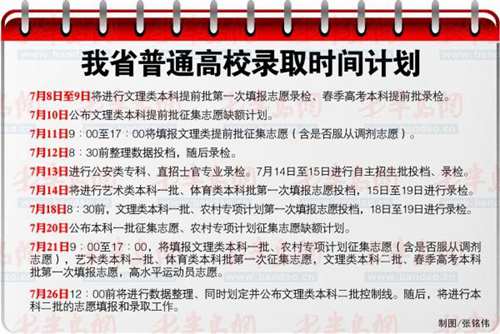 按照錄取時(shí)間計(jì)劃,7月5日9∶00至17∶00進(jìn)行了文理類本科提前批、本科一批、農(nóng)村專項(xiàng)計(jì)劃、體育類本科批第一次填報(bào)志愿,并且填報(bào)了自主招生批、春季高考本科提前批、文理類??铺崆芭驹?含直招士官生)。7月7日進(jìn)行了文理類本科提前批第一次填報(bào)志愿、春季高考本科提前批投檔。