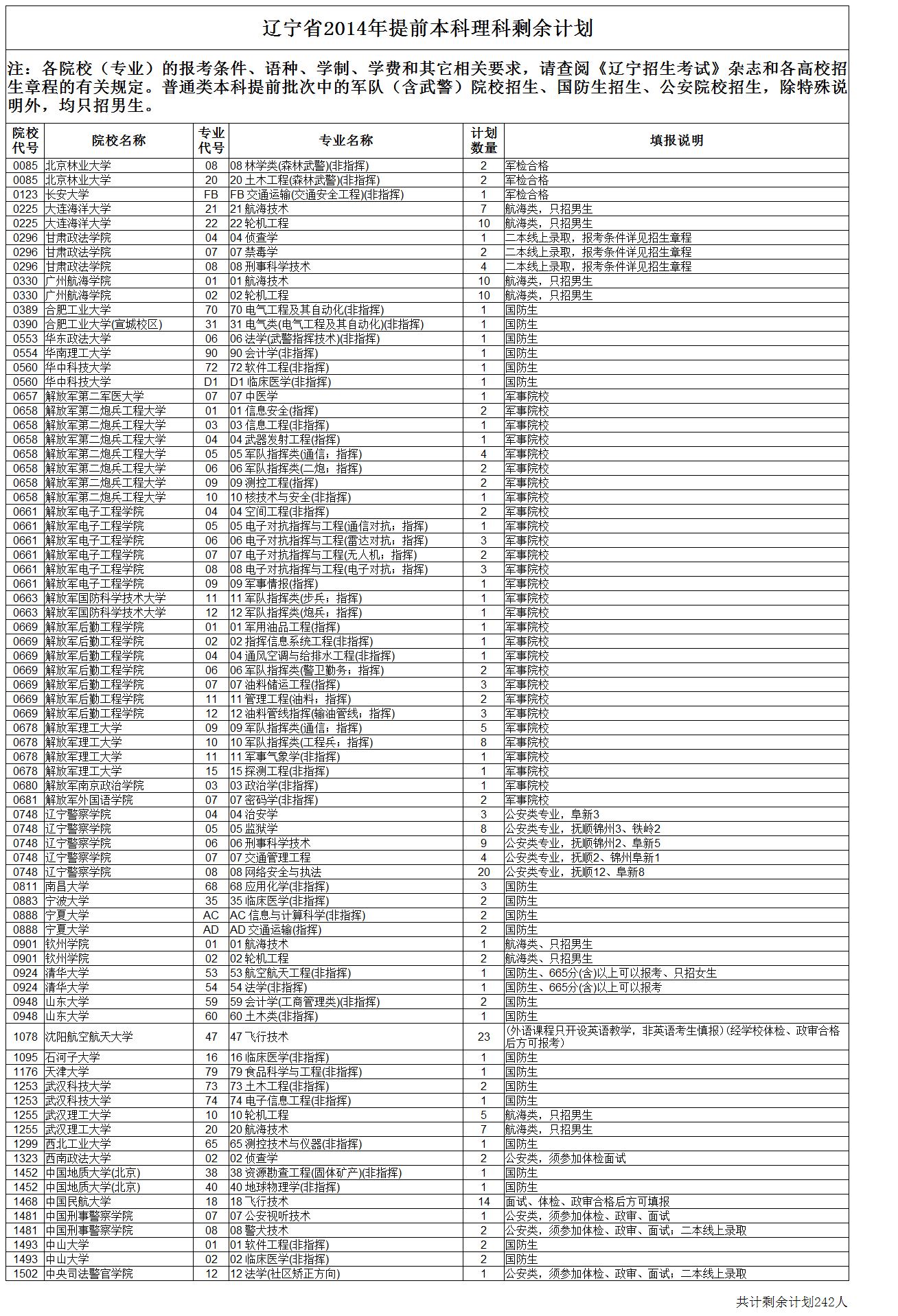 遼寧省2014年本科提前批理科剩余計劃(點擊查看)