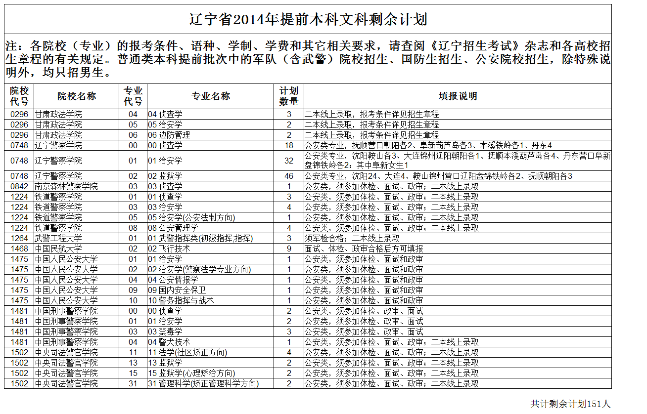 遼寧省2014年本科提前批文科剩余計劃(點擊查看)