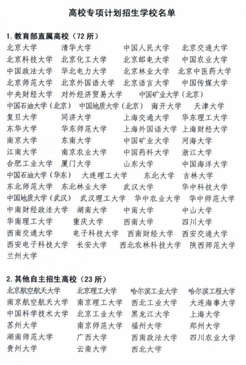 根據(jù)《教育部關(guān)于做好2015年重點(diǎn)高校招收農(nóng)村學(xué)生工作的通知》(教學(xué)【2015】3號(hào))要求,農(nóng)村學(xué)生單獨(dú)招生(以下簡稱高校專項(xiàng)計(jì)劃)由教育部直屬高校和其他自主招生試點(diǎn)高校承擔(dān)(高校名單見附表1)。