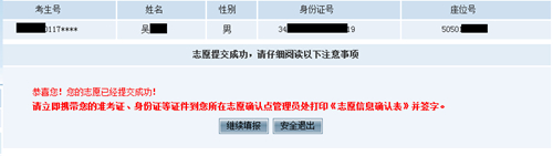 信息提交成功后將看到下面的頁面,如果下面的頁面沒有出現(xiàn),可能您的志愿沒有填報成功,請到志愿填報點老師處咨詢。
