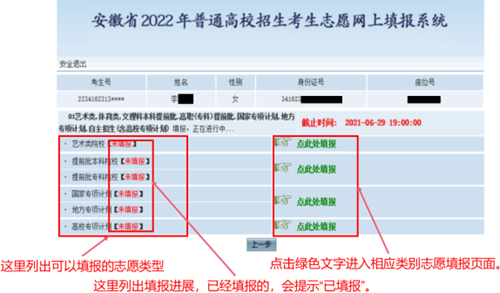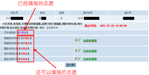 考生根據(jù)自己意愿選擇要填報的批次,點擊綠色“點此處填報”進入志愿填報頁面。