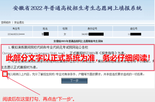 “下一步”按鈕:錄入完院校代碼和專業(yè)代碼后點擊進入志愿校對和確認頁面。
