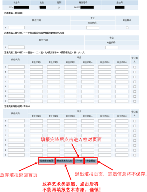 “放棄藝術類院校”按鈕:放棄藝術類院校志愿,不填報藝術類的院校。一旦放棄,考生將不能再次填報該類院校錄取,請慎重操作。