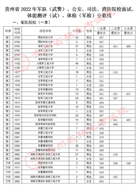 貴州:2022年軍隊(duì)(武警)、公安、司法、消防院校面試、體能測(cè)評(píng)(試)、體檢(軍檢)分?jǐn)?shù)線
