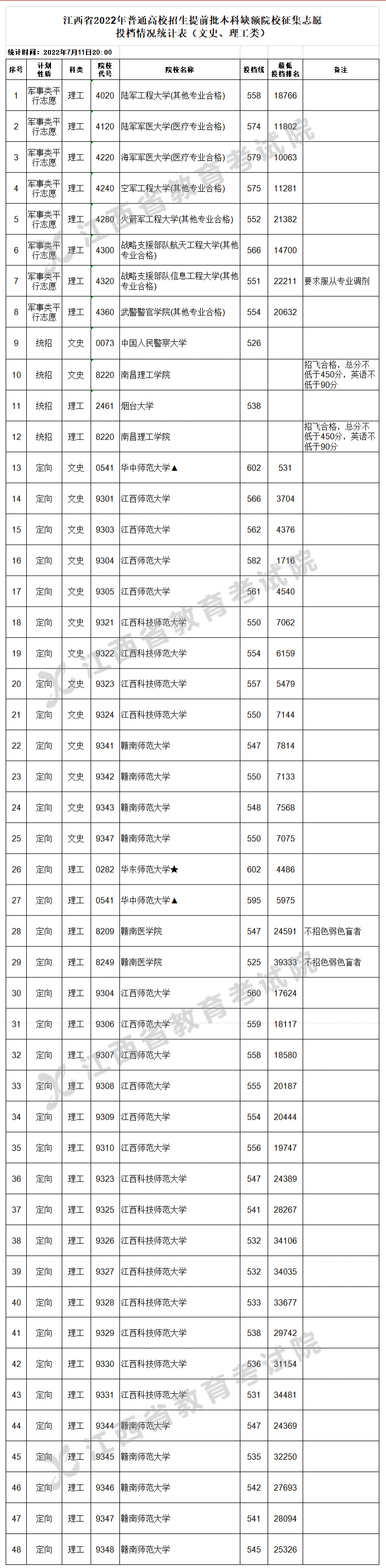 附件:江西省2022年普通高校招生提前批本科缺額院校征集志愿投檔情況統(tǒng)計(jì)表(文史、理工類) 點(diǎn)擊查看