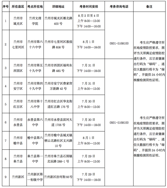 結(jié)合疫情防控有關(guān)要求,經(jīng)蘭州市相關(guān)部門綜合研判決定,采取由蘭州市公安局統(tǒng)一組織,考生就近在現(xiàn)居住地所在縣、區(qū)參加的方式,開展面試、體檢、體能測評?,F(xiàn)將各縣、區(qū)考點具體時間和地點公布如下(詳見下表)。請考生嚴(yán)格遵守所在地疫情防控要求,在滿足疫情防控通行條件的情況下,按公告要求參加測評,如有疑問請及時撥打考務(wù)咨詢電話。