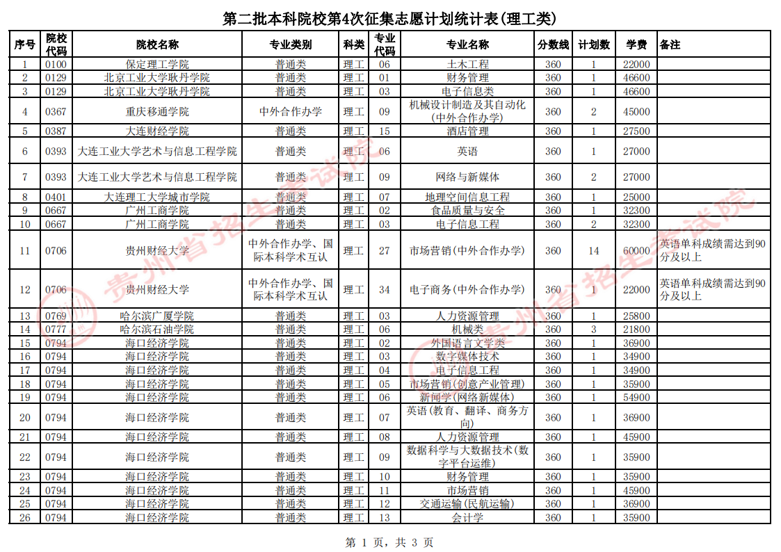 1.第二批本科院校第4次征集志愿計劃統(tǒng)計表(理工類)