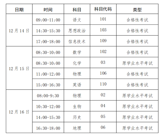 我區(qū)2022年下半年普通高中學(xué)業(yè)水平考試定于12月14日至16日舉行。其中,普通高中學(xué)業(yè)水平合格性考試(以下簡稱合格性考試),開考語文、數(shù)學(xué)、英語、思想政治、物理、信息技術(shù)等6門科目,報(bào)考對(duì)象主要為高中二年級(jí)學(xué)生;高考綜合改革前實(shí)施的原普通高中學(xué)業(yè)水平考試(以下簡稱原學(xué)業(yè)水平考試),開考物理、化學(xué)、生物、歷史、地理等5門科目,報(bào)考對(duì)象主要為需要補(bǔ)考相應(yīng)科目的高中三年級(jí)學(xué)生。考試方式均為筆試,實(shí)行試卷和答題卡分離模式,具體考試時(shí)間安排如下: