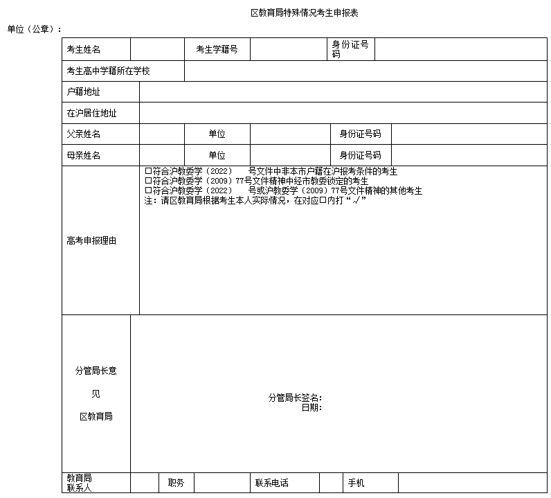 請各區(qū)教育局與相關部門通力協(xié)作,共同做好2023年上海市普通高??荚囌猩膱竺ぷ?。若有特殊情況,請于2023年4月14日前填妥《區(qū)教育局特殊情況考生申報表》(附件5),及時報市教委審批。