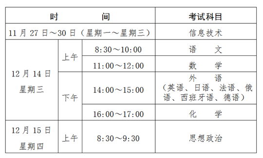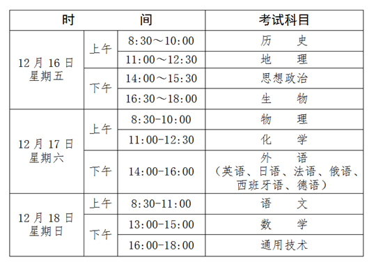 2.12月學(xué)業(yè)水平合格性科目為語(yǔ)文、數(shù)學(xué)、外語(yǔ)、化學(xué)、思想政治5個(gè)科目,時(shí)間為12月14日—15日。