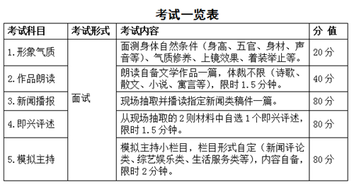 通過(guò)模擬主持廣播、電視、網(wǎng)絡(luò)等電子傳媒中不同類型的小欄目,考察考生的角色匹配、主持特質(zhì)、鏡頭形象、語(yǔ)言表現(xiàn)力及親和力、肢體副語(yǔ)言運(yùn)用情況等。