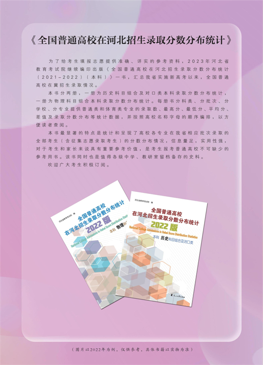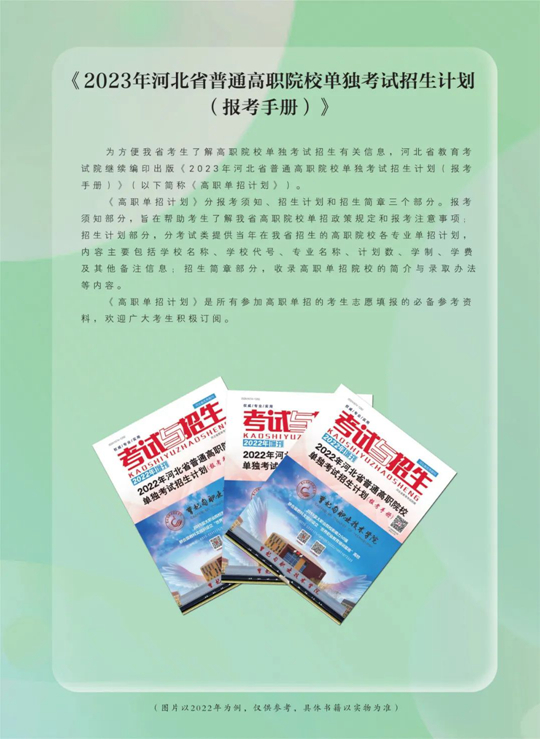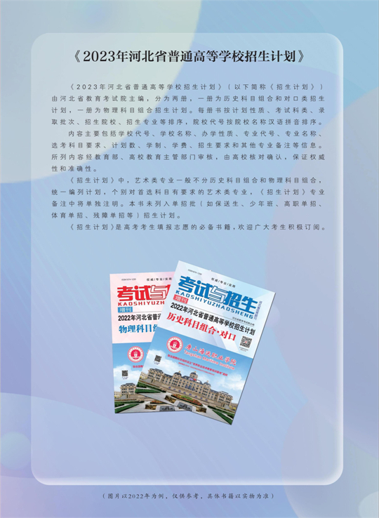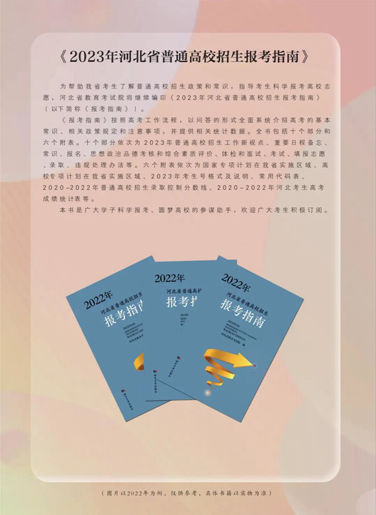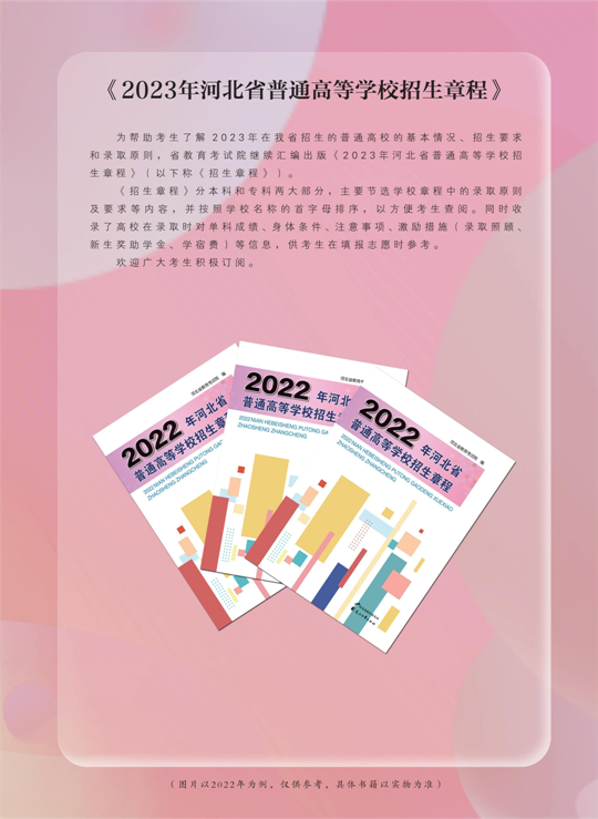 2023年我省普通高校招生考試報名工作于今日(10月27日)開始,標(biāo)志著2023年高考工作正式拉開序幕。高考考得好當(dāng)然重要,但填報志愿同樣重要,這就需要通過權(quán)威可靠的渠道了解招生考試政策、信息,未雨綢繆、提早準(zhǔn)備。今天為大家介紹由河北省教育考試院編印的系列招生考試資料,權(quán)威、專業(yè)、詳實(shí)。訂閱事宜在校考生可咨詢所在學(xué)校,社會考生可咨詢報名點(diǎn)。