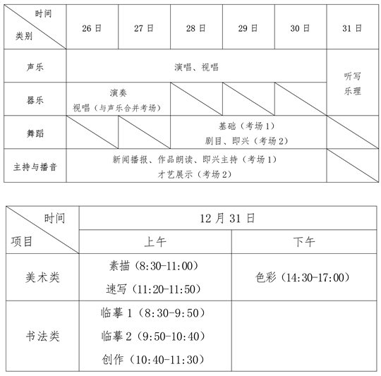 各類別考試形式、科目、內(nèi)容及要求詳見(jiàn)《藝術(shù)統(tǒng)考說(shuō)明》。各考試類別均不進(jìn)行復(fù)試。