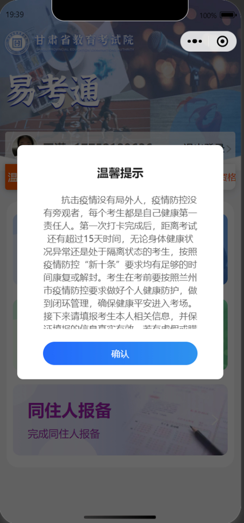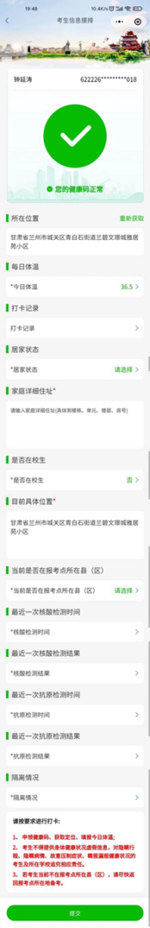 抗擊疫情沒有局外人,疫情防控沒有旁觀者,每個考生都是自己健康第一責(zé)任人。請考生根據(jù)要求認真填報本人相關(guān)信息,并保證填報的信息真實有效,若有虛假或瞞報由考生本人承擔(dān)一切責(zé)任。