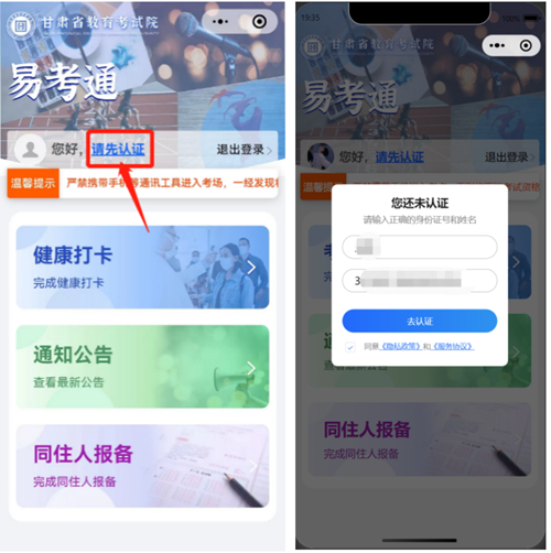受疫情影響,2023年我省普通高考報名僅完成了考生基本信息的采集,現(xiàn)場確認和考生資格審查工作尚未完成,為保障考生健康安全,統(tǒng)籌做好疫情防控和組考工作,保障考生應(yīng)考盡考,所有參加藝術(shù)統(tǒng)考考生務(wù)必于2022年12月17日8:00-18:00登錄“甘肅教育考試易考通”微信小程序(以下簡稱“易考通”)進行打卡,主要目的是:考生核對本人信息,確保應(yīng)考信息準(zhǔn)確無誤;加強考生健康狀況、地理位置摸查,便于研究制定組考防疫方案,優(yōu)化調(diào)整組考防疫措施,指導(dǎo)精準(zhǔn)分類管理,穩(wěn)妥做好考試組織工作;加強考生資格審查。具體操作過程如下: