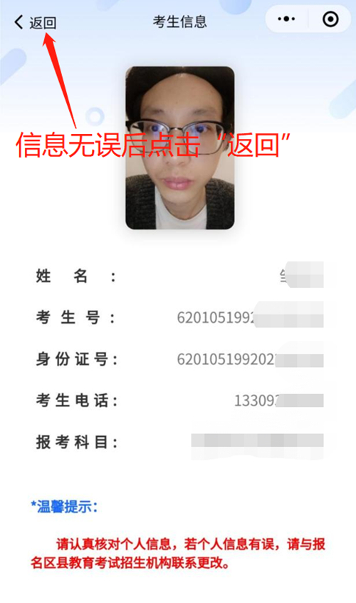 認證成功后,仔細核對本人信息,無誤后點擊“返回”