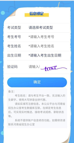 1.綁定個人信息時,一定要錄入準確的個人信息(考生號、姓名、出生日期)及驗證碼。個人信息務必和“河南省普通高校招生考生服務平臺”中的報名信息保持一致且必須確保報名結束。
