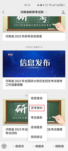 點擊“河南省教育考試院”微信公眾號菜單,選擇【微服務】->【藝考預約】,進入藝考預約的小程序,進行預約操作。