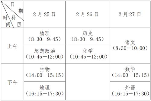 考試時間為2023年2月25日—27日。除語文科目考試時長為90分鐘外,其他各科目均為75分鐘。具體如下: