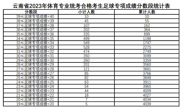 云南省2023年體育專(zhuān)業(yè)統(tǒng)考合格考生足球?qū)m?xiàng)成績(jī)分?jǐn)?shù)段統(tǒng)計(jì)表 點(diǎn)擊查看