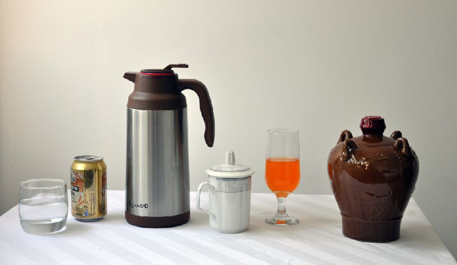 三、模擬寫生內(nèi)容:一個不銹鋼水壺,一個深色陶罐,一個盛有果汁的酒杯,一個帶蓋白瓷茶杯,一個金屬易拉罐,一個盛有清水的透明玻璃杯。(見圖片小樣)