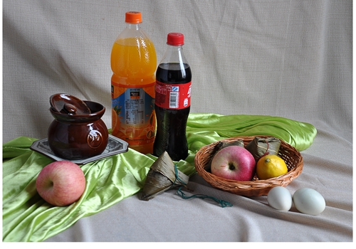 三、模擬寫生內(nèi)容:一瓶橙汁,一瓶可樂,一個帶蓋的陶罐,一個瓷盤,一個柳編盤,兩個蘋果,三個粽子,一個檸檬,兩個鴨蛋,一塊綠色襯布、一塊淺色襯布。(見圖片小樣)