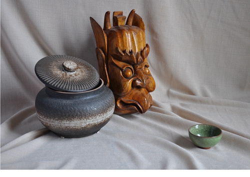 三、模擬寫生內(nèi)容:一個木制儺面具,一個帶蓋的陶罐,一個小陶瓷茶杯,一塊淺色襯布。(見圖片小樣)