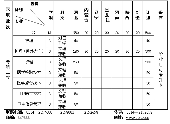 2011年承德護(hù)理職業(yè)學(xué)院各省、市招生計(jì)劃表