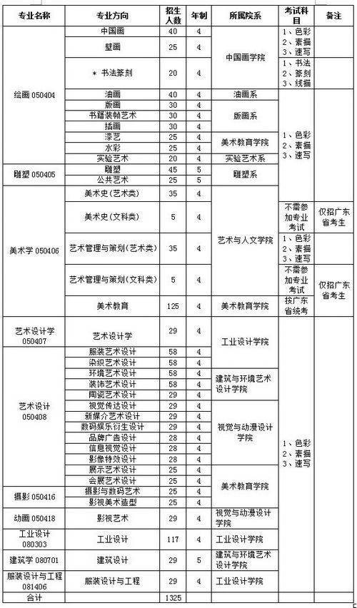 學(xué)?,F(xiàn)有中國(guó)畫(huà)學(xué)院、造型藝術(shù)學(xué)院、建筑與環(huán)境藝術(shù)設(shè)計(jì)學(xué)院、工業(yè)設(shè)計(jì)學(xué)院、視覺(jué)與動(dòng)漫設(shè)計(jì)學(xué)院、美術(shù)教育學(xué)院、藝術(shù)與人文學(xué)院、繼續(xù)教育學(xué)院等8個(gè)學(xué)院和1個(gè)思想政治理論課教學(xué)部。本科教育設(shè)有繪畫(huà)、雕塑、美術(shù)學(xué)、藝術(shù)設(shè)計(jì)、藝術(shù)設(shè)計(jì)學(xué)、工業(yè)設(shè)計(jì)、建筑學(xué)、攝影、動(dòng)畫(huà)、服裝設(shè)計(jì)與工程、博物館學(xué)等11個(gè)專(zhuān)業(yè),38個(gè)專(zhuān)業(yè)方向。研究生教育有美術(shù)學(xué)、設(shè)計(jì)學(xué)、藝術(shù)學(xué)理論3個(gè)一級(jí)學(xué)科碩士點(diǎn)和1個(gè)專(zhuān)業(yè)學(xué)位點(diǎn)(藝術(shù)碩士)。學(xué)校的“美術(shù)學(xué)”為省級(jí)重點(diǎn)學(xué)科,“設(shè)計(jì)藝術(shù)學(xué)”為省級(jí)重點(diǎn)扶持學(xué)科。“藝術(shù)設(shè)計(jì)”、“繪畫(huà)”、“工業(yè)設(shè)計(jì)”、“雕塑”是教育部確定的國(guó)家級(jí)特色專(zhuān)業(yè),“美術(shù)學(xué)”等5個(gè)專(zhuān)業(yè)是省級(jí)特色專(zhuān)業(yè),水彩畫(huà)、雕塑創(chuàng)作、創(chuàng)作(油畫(huà))、設(shè)計(jì)基礎(chǔ)——創(chuàng)意表達(dá)、廣告創(chuàng)意等5門(mén)課程被評(píng)為省級(jí)精品課程。學(xué)校是“廣東省高校美術(shù)與設(shè)計(jì)教育專(zhuān)業(yè)委員會(huì)”歷屆會(huì)長(zhǎng)單位、“廣東省高等學(xué)校工業(yè)設(shè)計(jì)教學(xué)指導(dǎo)委員會(huì)”主任單位、廣東省學(xué)校藝術(shù)教育活動(dòng)(美術(shù))培訓(xùn)基地、廣東省美術(shù)與設(shè)計(jì)教育培訓(xùn)中心、第16屆亞運(yùn)會(huì)整體視覺(jué)設(shè)計(jì)研究中心和廣東省創(chuàng)意產(chǎn)業(yè)研發(fā)中心。