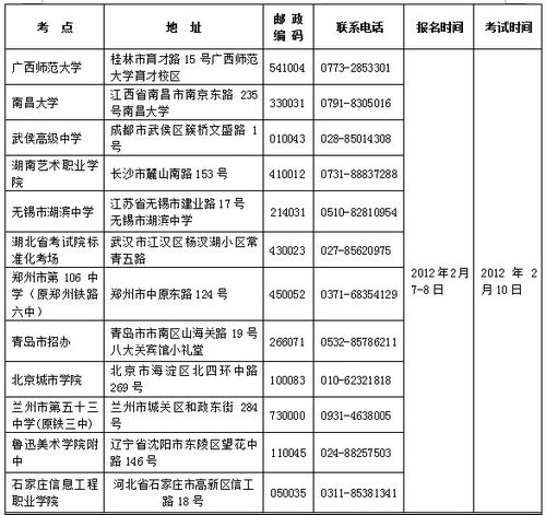 考點(diǎn) | 地址 | 郵政編碼 | 聯(lián)系電話 | 報(bào)名時(shí)間 | 考試時(shí)間 |