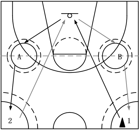 考生在準(zhǔn)備區(qū)站好,聽到開始指令后用右手做運(yùn)球接行進(jìn)間投籃,投中后運(yùn)球在A區(qū)做一次背后運(yùn)球后運(yùn)球至第2準(zhǔn)備區(qū);進(jìn)入第2準(zhǔn)備區(qū)后返回用左手運(yùn)球接行進(jìn)間投籃,投中后運(yùn)球在B區(qū)做一次后轉(zhuǎn)身運(yùn)球至第1準(zhǔn)備區(qū)。