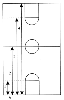 如右圖,測試者A按1、2、3、4順序跑完全程。從一側(cè)端線開始,聽到信號(hào)后出發(fā),至近側(cè)罰球線急停,轉(zhuǎn)身迅速折回至起跑的端線,急停轉(zhuǎn)身,跑至中線,折回端線,急停轉(zhuǎn)身跑向另一側(cè)罰球線,折回至原起跑的端線急停轉(zhuǎn)身,跑至另一側(cè)端線,折回沖刺至原起跑的端線。