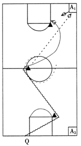 ?、贉y者將球放在限制線上,用腳的任何部位向圈內(nèi)傳球,球落在圈內(nèi)或線上均有效。