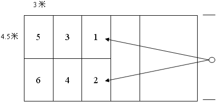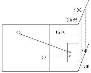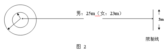 ?、谠u(píng)分方法。球的落點(diǎn)在半徑1米的圓內(nèi)或圓的線上得5分,1.5米的圓內(nèi)或圓的線上得4分,2米的圓內(nèi)或圓的線上得3分,2.5米圓內(nèi)或圓的線上得2分,3米圓內(nèi)或圓的線上得1分;5次得分之和為該項(xiàng)成績。