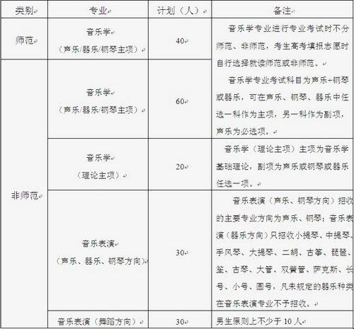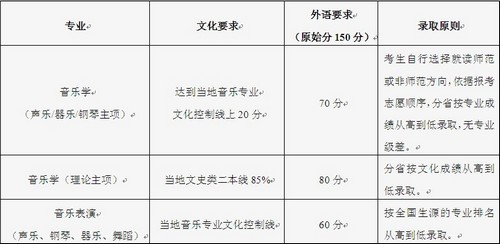 備注:①音樂學(聲樂/器樂/鋼琴主項)專業(yè)各省前三名(計劃人數(shù)在5人以上),原則上可以降低20分(原始分)錄取。