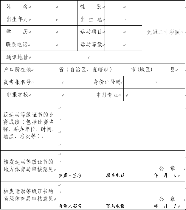 2. 運動等級以國家體育總局官網(wǎng)“運動員技術(shù)等級查詢系統(tǒng)“數(shù)據(jù)為準(zhǔn),未查詢到相關(guān)數(shù)據(jù)的考生必須填寫此表。