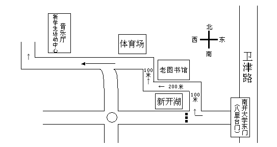 乘車路線:1、天津火車站下車后乘8路或832路公共汽車到八里臺南開大學(xué)站,下車即到南開大學(xué)東門,進(jìn)校門之后如圖: