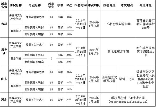 2014年我校藝術(shù)類播音與主持藝術(shù)專業(yè)、音樂表演專業(yè)(聲樂)和音樂表演專業(yè)(舞蹈)專業(yè)在以下省市組織專業(yè)單獨測試(???;其余未涉及到的全國各省、直轄市、自治區(qū)(以下簡稱省市)和專業(yè)均不組織專業(yè)單獨測試(???,承認生源地統(tǒng)考專業(yè)成績。